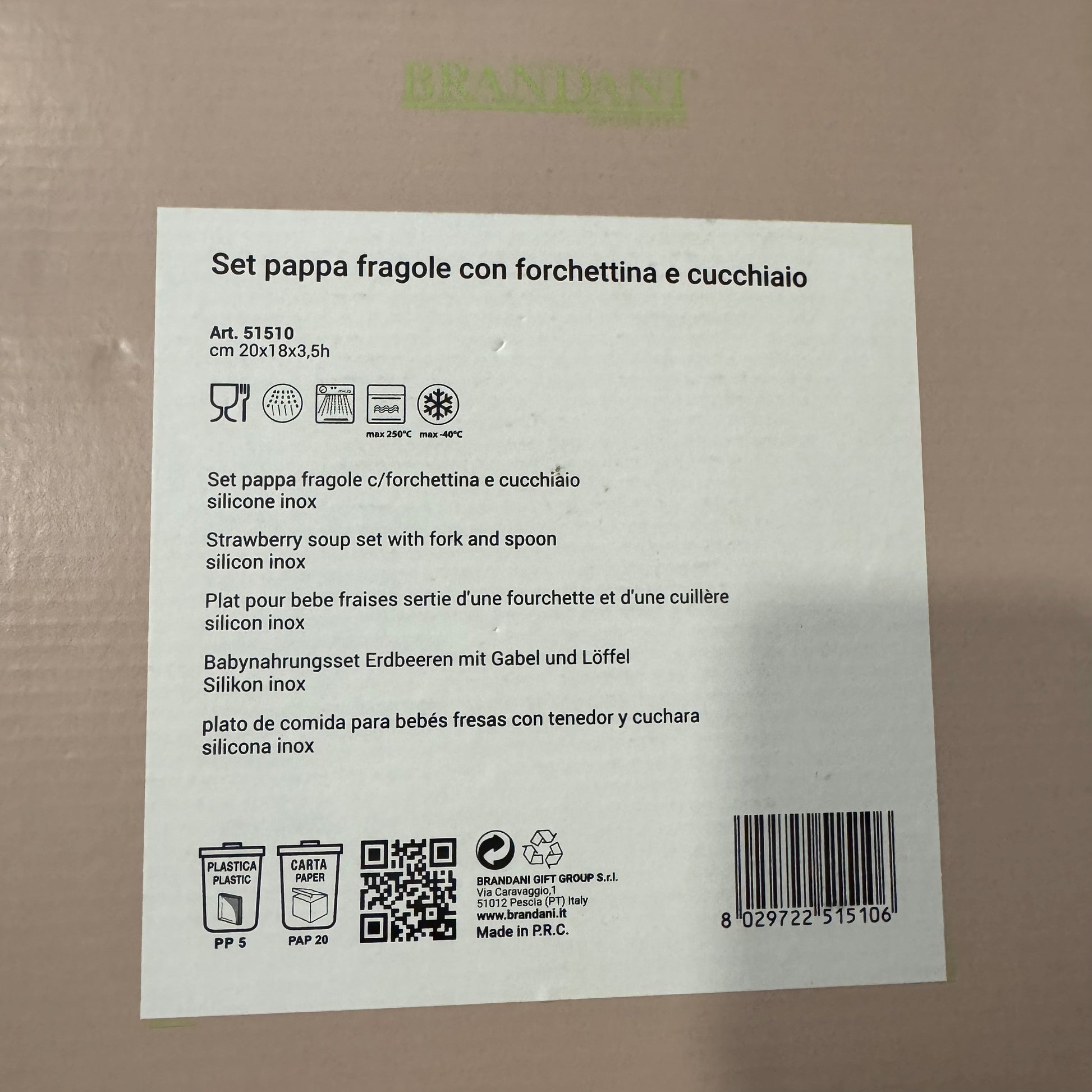 Divertente e pratico Set Pappa Baby “Fragola” di Brandani, composto da un Piatto/Vassoio con scomparti, in Silicone a forma di Fragola, Forchettina e Cucchiaio in Silicone/Inox. Trasforma la Pappa dei tuoi bimbi in un momento Sereno e divertente.